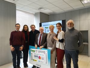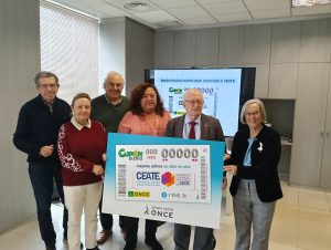 Luis Natalio Royo, delegado de la ONCE en Madrid, y María Teresa Rodríguez, presidenta del Consejo Territorial de la ONCE en Madrid, han entregado a Gonzalo Berzosa, presidente de CEATE, una lámina enmarcada con este cupón que incluye el lema ‘Mayores activos un valor en alza’.
